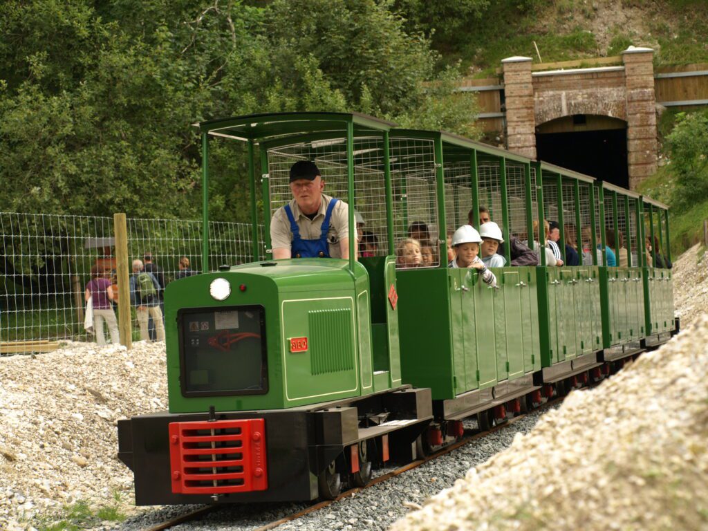 Fra midt i maj til midt i august kan du få en køretur med minetoget, der snor sig forbi store dynger af flint og kalk ned igennem det åbne kalkbrud og ind i gruberne. Undervejs kommer du også forbi underjordiske bække og søer. Turen med minetoget giver dig et godt indblik i tidligere tiders arbejde i kalkværket. Minetoget ender ved den store sø med grubebio.