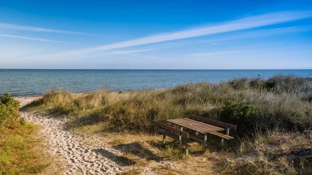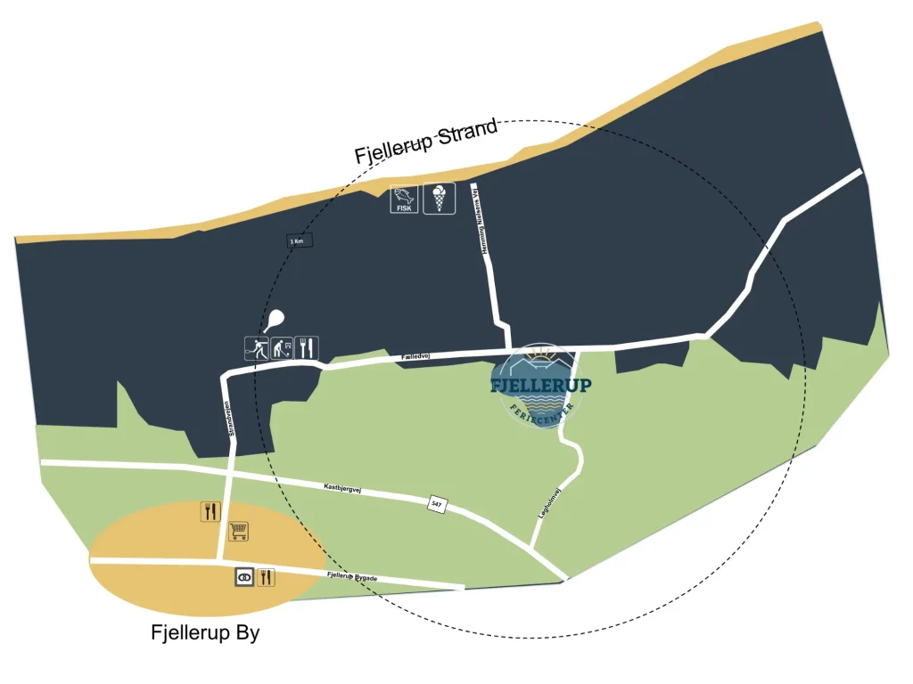 Fjellerup Feriecenter ligger i kort afstand til både indkøbsmuligheder, strand og smukke skovområder. Kun få minutters gang fra husene finder I den børnevenlige Fjellerup Strand, som er kendt for sit klare vand og brede sandstrækning, der gør den perfekt til en dukkert eller en lang gåtur i aftensolen.