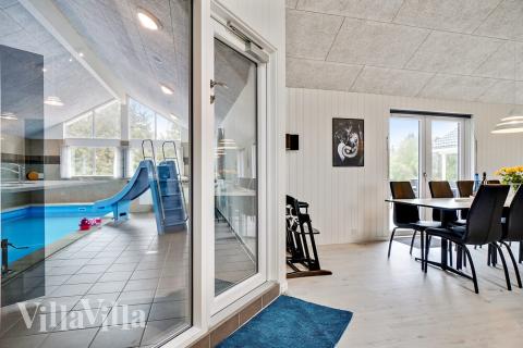 Enhver familie har vandhunde og plaskeglade medlemmer – og deres forventninger kan indfries til fulde i sommerhusets poolafdeling. Her finder I nemlig både et stort spabad og en lækker sauna, foruden den 23 m2 store swimmingpool, hvor I kan plaske og bade dagen lang. Poolen har både romersk trappe, vandrutsjebane og modstrømsanlæg.
