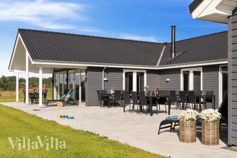 Når der skal laves mad til 30 personer, kræver det god plads og godt udstyr. Derfor er dette sommerhus udstyret med to ovne, to komfurer, to opvaskemaskiner og to håndvaske. Her er desuden rigeligt med køleskabsplads til madvarer. Det stilfulde køkken befinder sig i opholdsrummet med langt spisebord og sofahjørne foran fjernsynet.