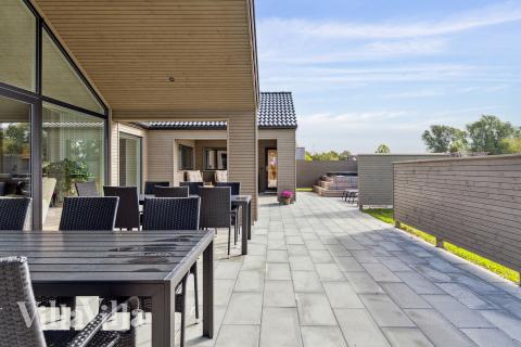 Nej. Som standard er der ingen parasol eller havehynder i vores huse. Mange huse har en delvis overdækket terrasse.