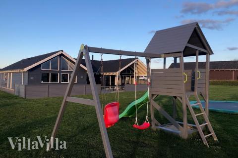 Også udenfor er der god plads til alle gæster. Der kan slappes af på den delvist overdækkede terrasse, mens husets mindste gæster kan hygge sig i sandkassen, hoppe på trampolinen eller tage en gyngetur.