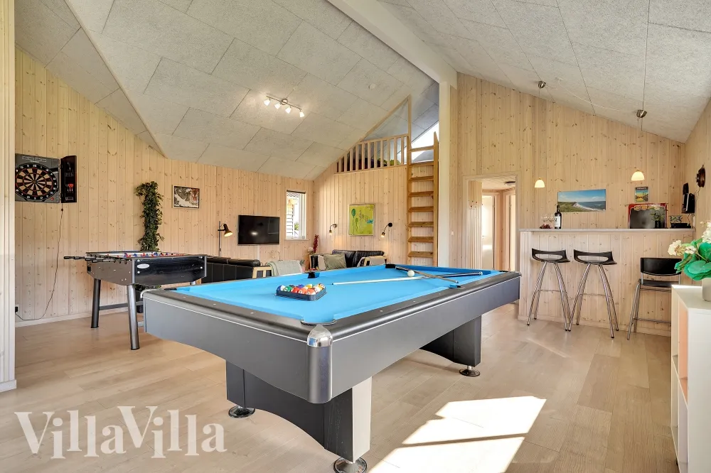 Dette flotte sommerhus ligger ved Skåstrup Strand tæt på den hyggelige købstad Bogense. Der er mulighed for både skønne naturoplevelser og spændende attraktioner på Fyn - og for en masse indendørsaktiviteter, hvis du vælger at holde ferie i dette Skanlux-hus. Husets pool-afdeling rummer en 18 m2 stor pool med modstrømsanlæg og rutsjebane. Her findes også spabad og sauna, som giver varme på selv de koldeste dage. I husets store aktivitetsrum kan der dystes i flere forskellige aktiviteter. Her findes bordtennis,... Læs mere