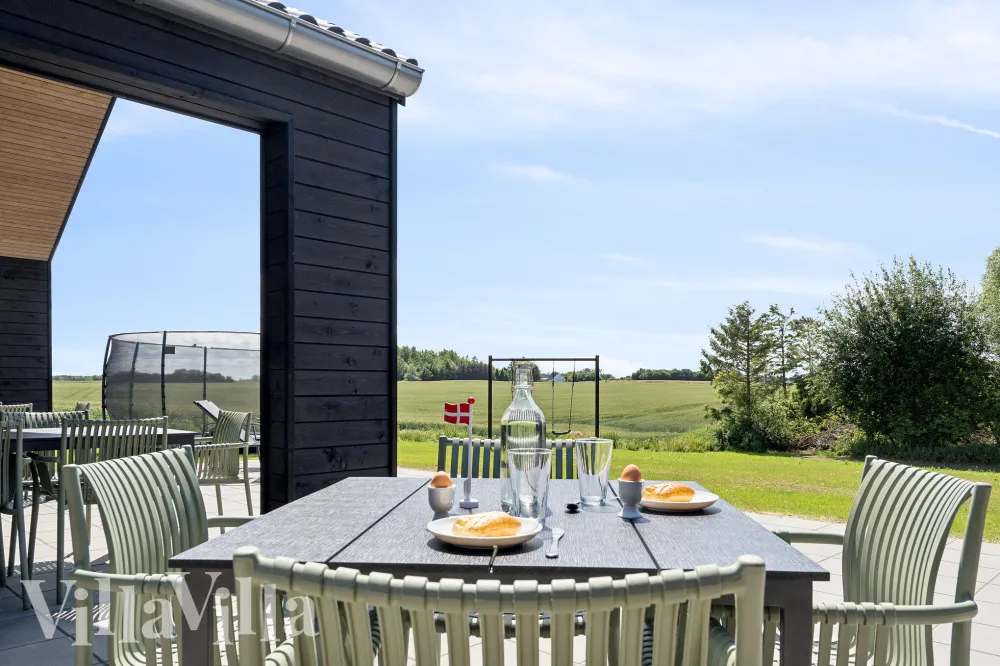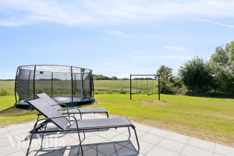 Efter en dag fyldt med aktiviteter og afslapning er terrassen det naturlige samlingspunkt. Her indbyder havemøbler og grill til lange sommeraftener, hvor I kan nyde hinandens selskab og den fantastiske udsigt over de naturskønne omgivelser. Haven byder på oplevelser for både børn og voksne med en nedgravet trampolin og gynger, der skaber rammerne for leg og aktivitet for de yngste, mens de voksne kan finde ro og nyde den afslappede stemning.