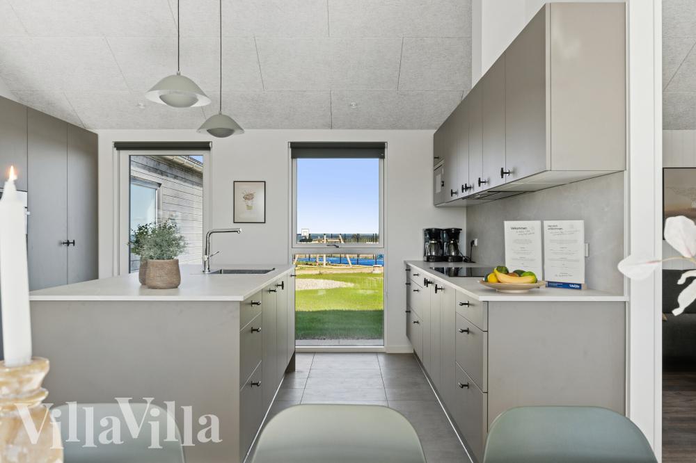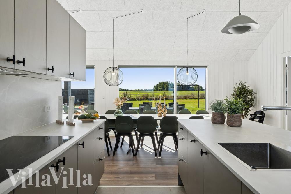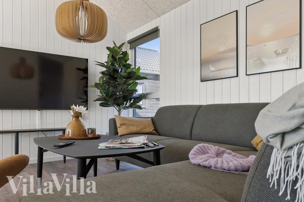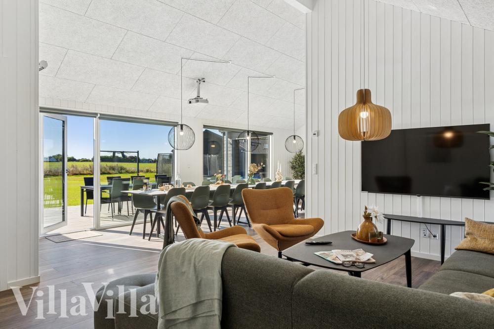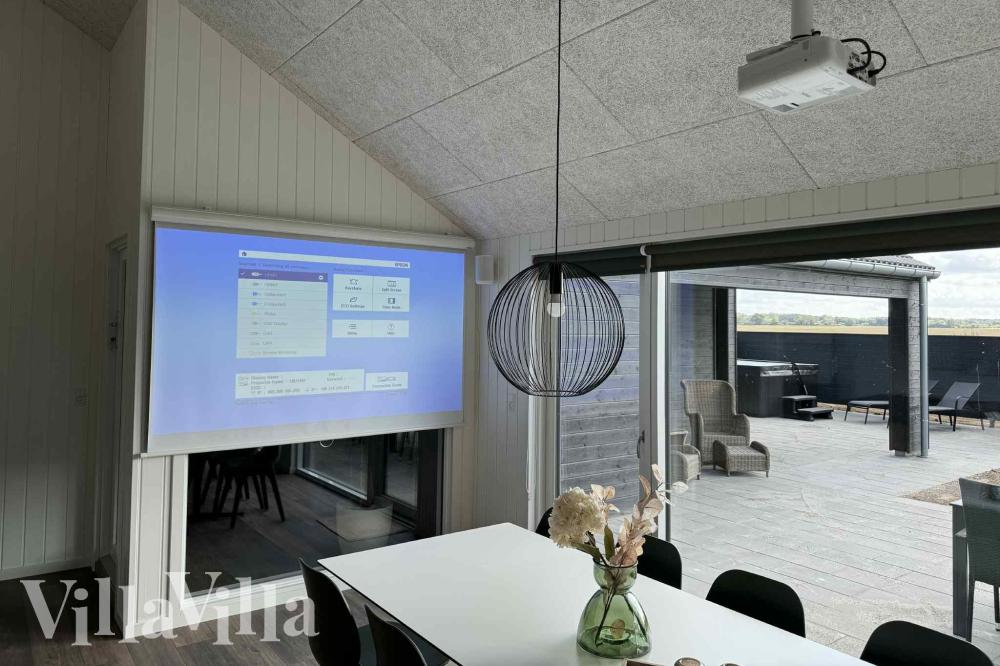 Det store køkken-alrum er husets samlingspunkt. Her kan alle samles omkring det lange spisebord, mens det fuldt udstyrede køkken med dobbelte ovne og opvaskemaskiner gør madlavningen nem. I stuen venter bløde sofaer – ideelt til en rolig stund efter en dag på stranden. Sommerhuset er også velegnet til firmaarrangementer og teambuilding, da det er udstyret med projektor og lærred – perfekt til præsentationer, workshops eller fælles filmaftener.