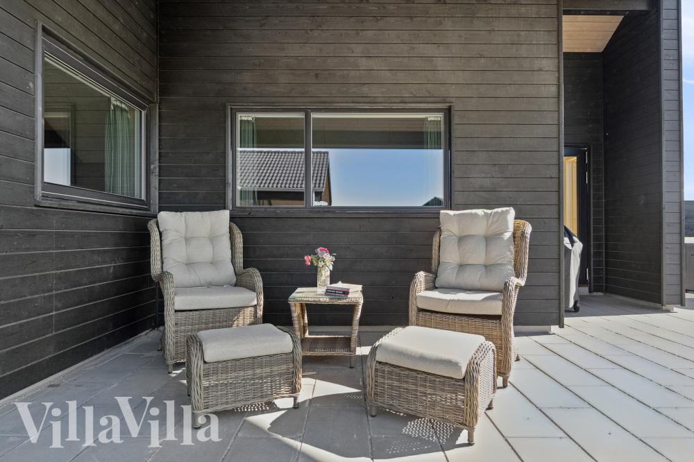 Nej. Som standard er der ingen parasol eller havehynder i vores huse. Mange huse har en delvis overdækket terrasse.