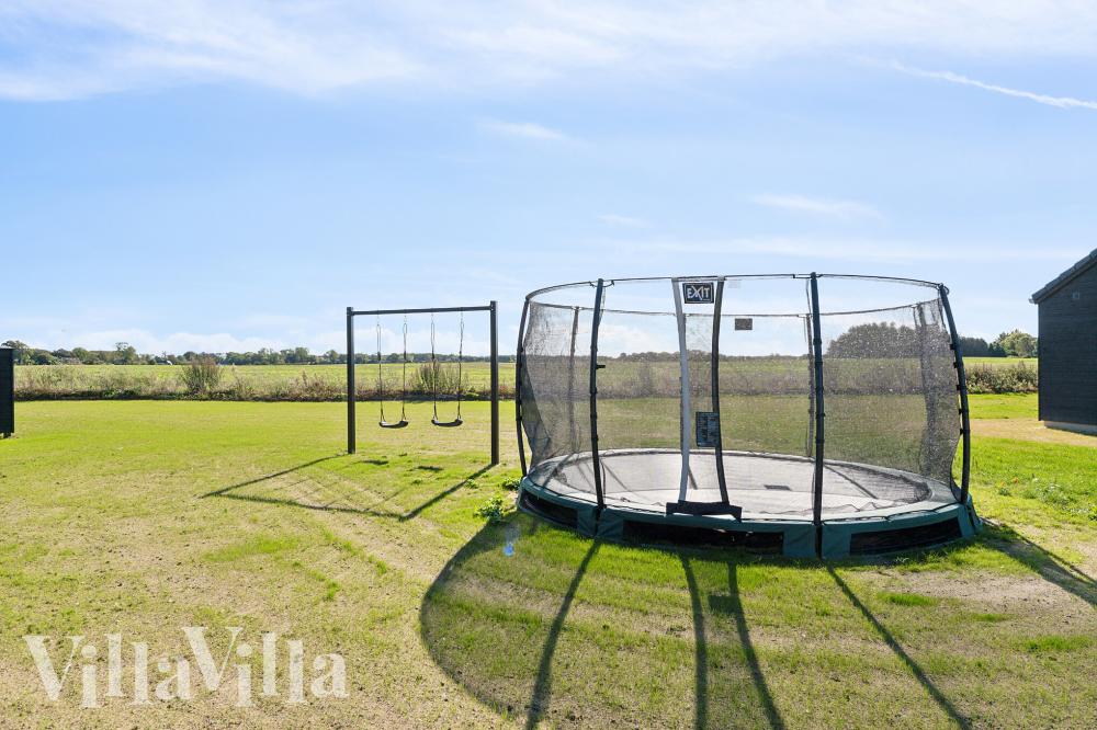 På den store terrasse er der plads til både sol og skygge med loungemøbler, grill og langbord. Haven har trampolin og gynger, og den korte afstand til Skåstrup Strand gør det nemt at tage en dukkert, bygge sandslotte eller gå en tur ved vandet.