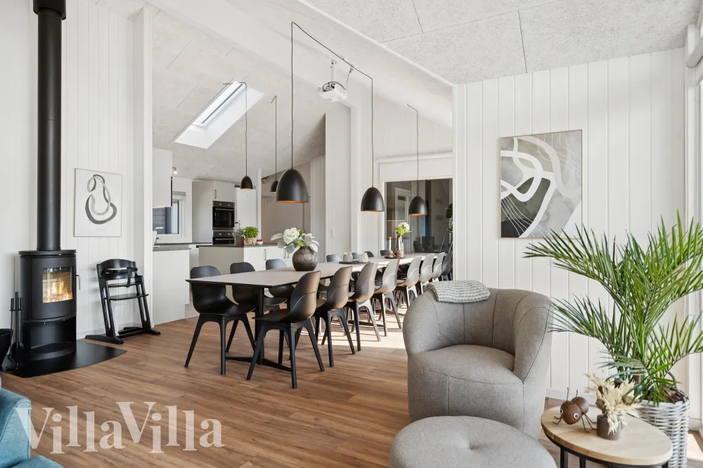 Husets store køkken-alrum er sommerhusets hjerte, her er plads til, at alle kan samles om måltiderne, og med det veludstyrede XL-køkken, der har to ovne, to opvaskemaskiner og to køleskabe, bliver madlavningen både nem og hyggelig – selv for en stor gruppe. Efter middagen kan I trække jer tilbage i den hyggelige stue, hvor brændeovnen spreder varme og skaber en afslappet atmosfære. Udsigten til grunden giver et dejligt lysindfald, og sofaerne indbyder til både brætspil, gode samtaler og ren afslapning.