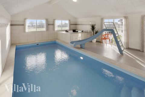 Et andet populært rum er sommerhusets ”badeland”. Her er en stor swimmingpool med vandrutsjebane, modstrømsanlæg og romersk trappe. I det lækre spabad eller den lune sauna kan I slappe af og nyde ferien. Fyldes spabadet kun en smule kan det uden bobler anvendes som babypool/soppebassin for de yngre børn.
