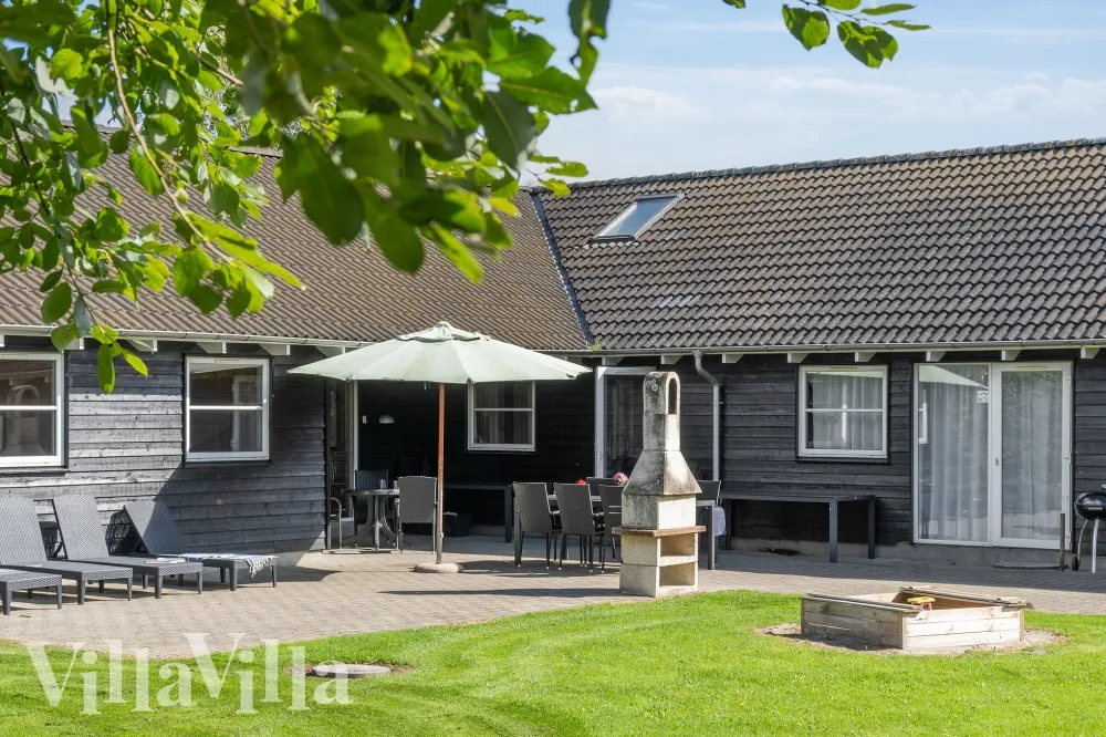 Den danske sommer kan nydes på den delvist overdækkede terrasse, mens børnene gynger eller leger i sandkassen.