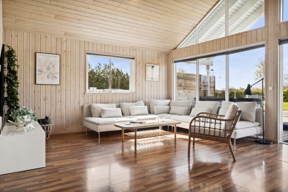 Dette velindrettede sommerhus er opført af Skanlux nær den dejlige sandstrand i Marielyst.