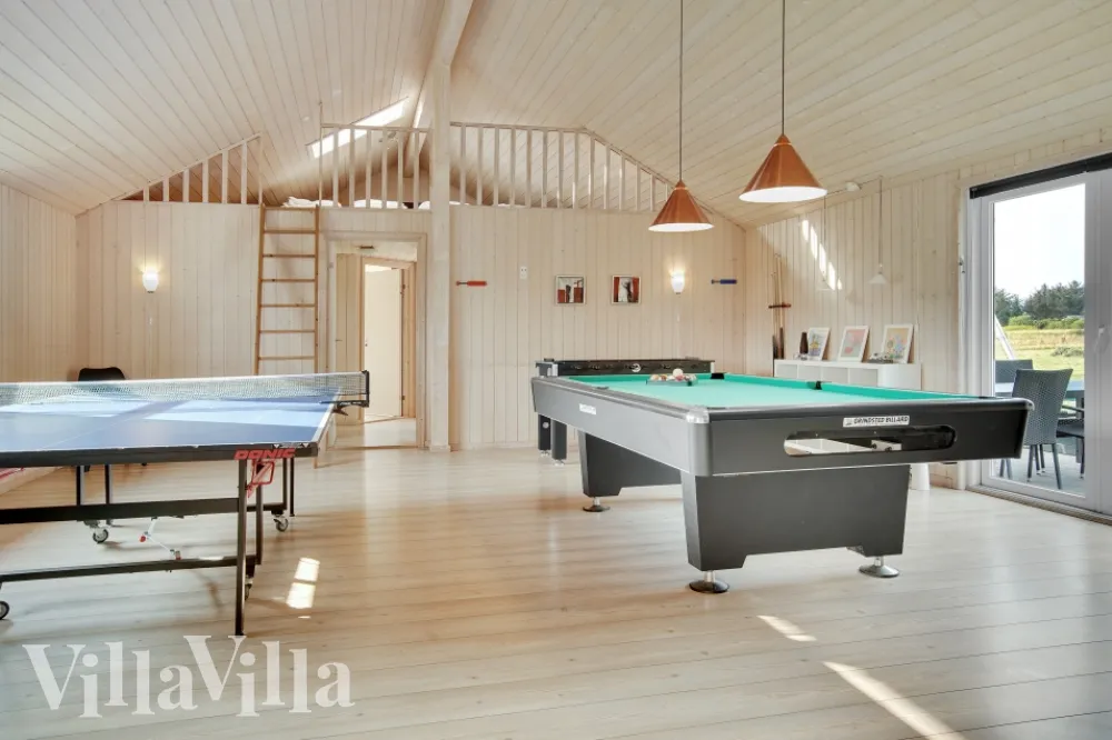 Sommerhuset har et spændende aktivitetsrum, hvor hele familien kan dyste i billard, bordtennis, bordfodbold og dart. Skulle spillelysten ikke være styret endnu, kan I også udfordre hinanden på husets Playstation4.