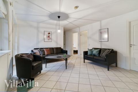I det store opholdsrum kan alle sammes til hyggelig fællesspisning ved langbordet, og madlavningen til mange er klares nemt i det rummelige og veludstyrede XL-køkken.