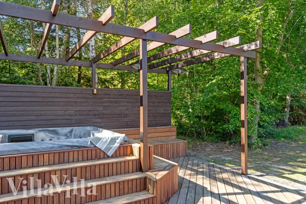 Huset ligger på en ældre naturgrund med gynger og masser af plads, mens børnene slår sig løs med leg, kan de voksne med fordel trække hen i den udendørs wellnessafdeling. Her finder I en lækker træterrasse med trappeopbygget udespa under en pergola, privat udebruser og lækker sauna med udgang til haven. Som et ekstra plus er der også en stor stenterrasse, som I har direkte udgang til fra sommerhusets opholdsrum. Afslut dagen i godt selskab omkring det hyggelige bålsted, hvor I kan nyde varmen fra flammerne under den stjerneklare himmel.
