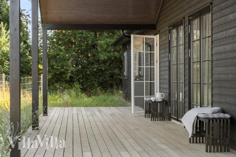 Nej. Som standard er der ingen parasol eller havehynder i vores huse. Mange huse har en delvis overdækket terrasse.