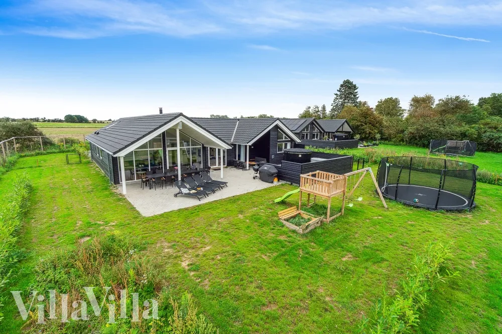 Udendørs kan der grilles på husets gasgrill og slappes af i havemøblerne på sommerhusets terrasse. I husets indhegnede have er der opsat gynge og sandkasse til luksushusets yngste gæster – derudover finder I også en nedgravet trampolin.