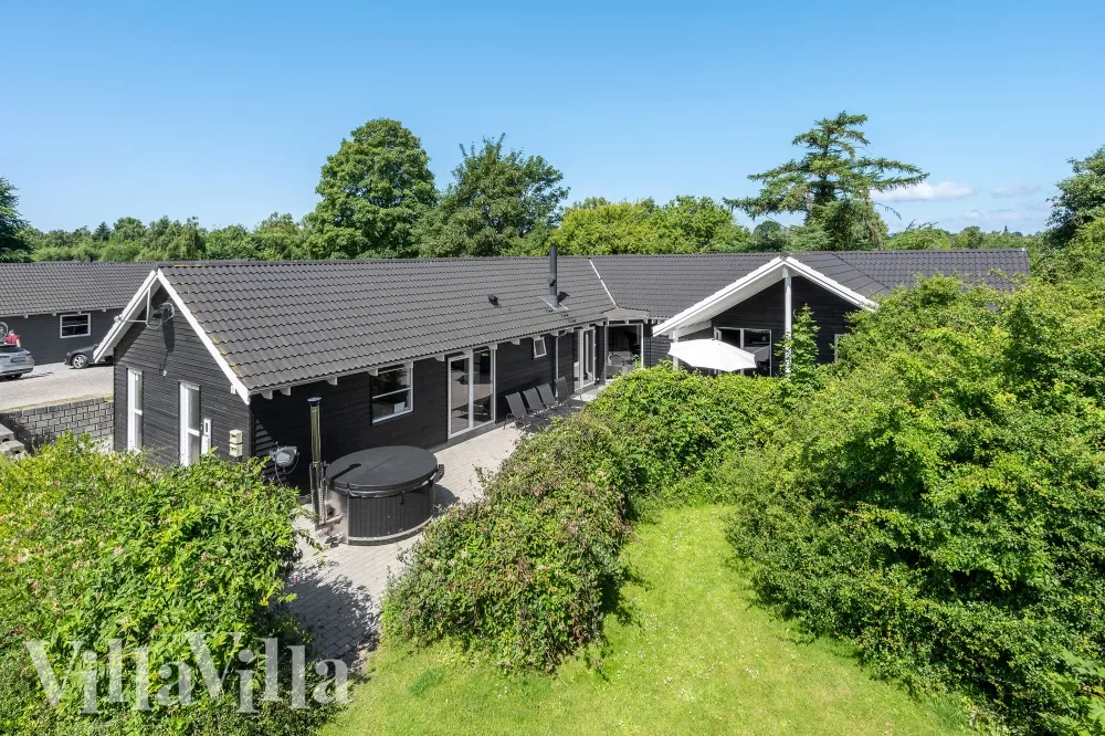 Udendørs finder I den 100 m2 flisebelagt terrasse, omkranset af smuk beplantning. Her kan aftensmaden tilberedes på en af de 2 kuglegrill, og nydes ved det overdækkede møblement. Solen kan nydes på solstolene, og børnene kan lege på legepladsen, eller boltre sig frit på den 2.800 m2 store naturgrund.