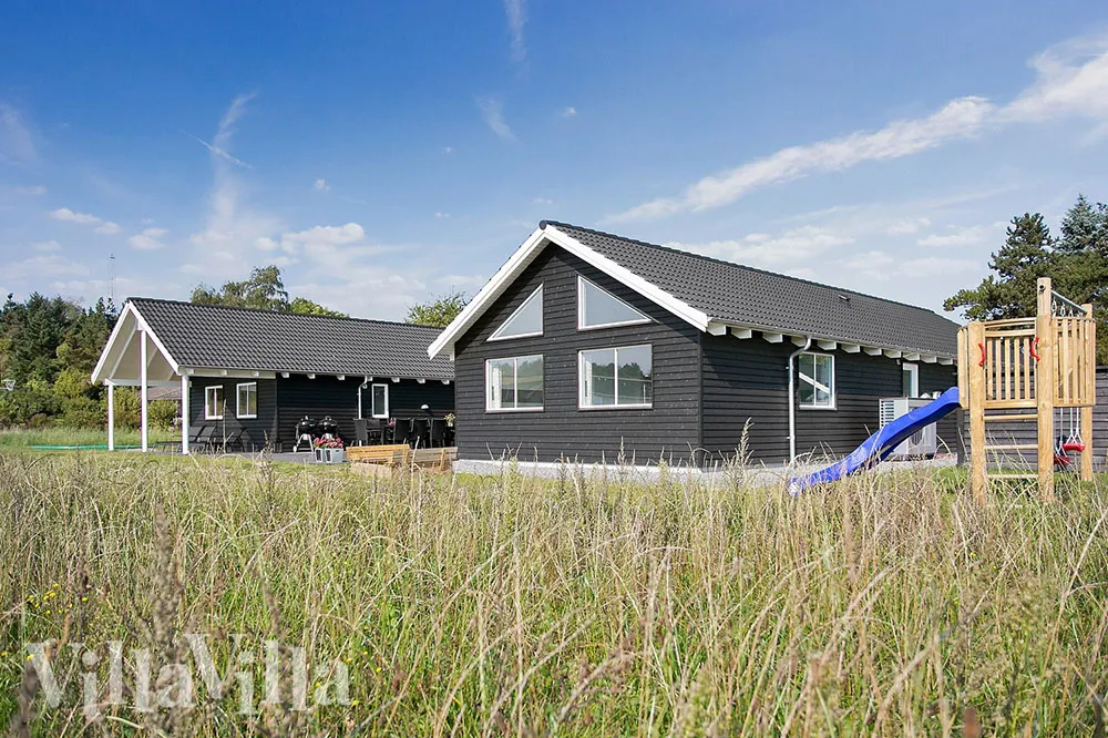 Sommerhuset har en stor terrasse, hvor sommeren kan nydes. Her er grill og havemøbler og børnene kan lege i gyngestativet og hoppe på trampolinen i haven. Terrassen er delvist overdækket, så der kan grilles året rundt.