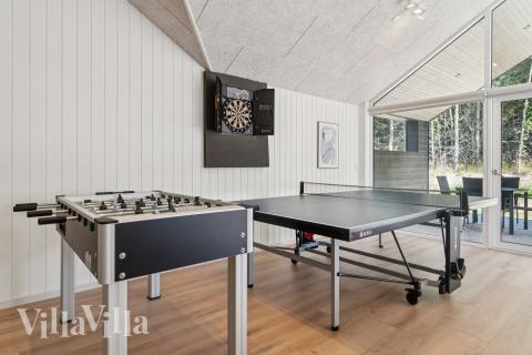 En af boligens absolutte højdepunkter er den indendørs pool med rutsjebane, som både børn og voksne vil elske. Efter en sjov dag i vandet kan I slappe af i spaen eller saunaen, der tilfører ekstra luksus og afslapning. Aktivitetsrummet giver jer mulighed for at konkurrere i billard, bordtennis, dart eller bordfodbold, og i baren med køleskab kan I nyde kolde drikkevarer undervejs.