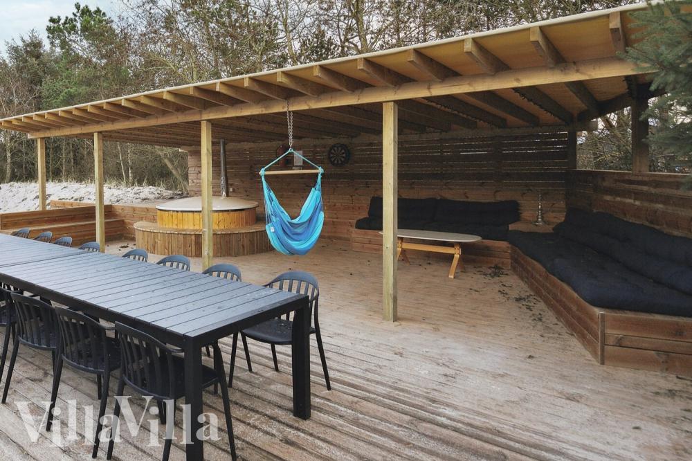 Udendørs finder I hele tre lækre terrasser, hvoraf nogle er delvist overdækkede – perfekte til både morgenkaffe, solbadning og hyggelige grillmiddage. Under den ene overdækning er der indrettet en stemningsfuld bar med loungeområde, hvor I kan samles til afslappede stunder. Der er desuden en indbydende udespa klar, som sætter prikken over i’et på ferieoplevelsen. Haven er lukket, så børnene trygt kan lege, mens de voksne nyder ferien i fredelige omgivelser.