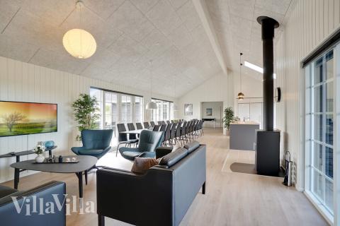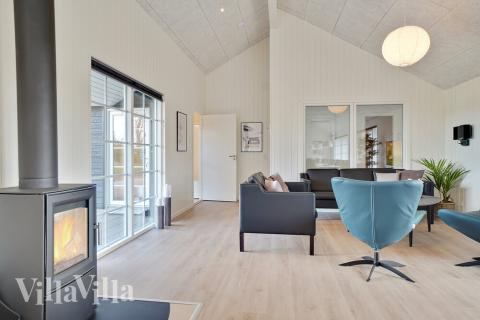I et sommerhus hører en brændeovn, som kan lune på kølige dage! Den finder I i sommerhusets opholdsrum, tæt på både sofakrog og det lange spisebord med udsigt til terrassen. Det stilfulde køkken er veludstyret og har både to opvaskemaskiner, to ovne, to komfurer, to håndvaske og god køleskabsplads.