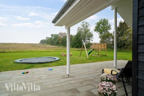 Udendørs finder I håndvask med bord, som kan bruges som både grovkøkken eller fiskerenseplads, hvor lystfiskeren kan rense dagens fangst. Den delvist overdækkede terrasse er udstyret med havemøbler og grill. I haven er der både gynge, sandkasse og trampolin til de yngste gæster.