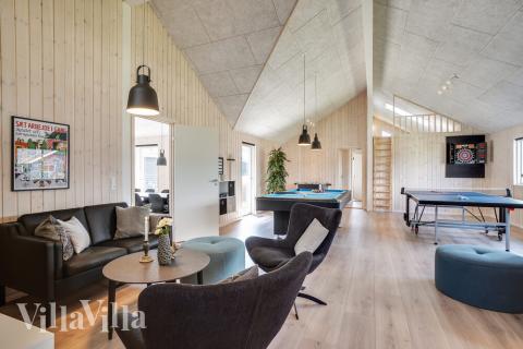 Dette store sommerhus har plads til 20 personer og er fyldt med aktiviteter, som indbyder til mange timers sjov og leg. Uanset årstiden er I sikret en svømmetur i den 20 m2 store indendørs pool med vandrutsjebane. Med den romerske trappe er det nemt for alle at komme i poolen. I poolafdelingen finder I også et stort boblebad og en lækker sauna. Sommerhuset har et flot køkkenalrum med højt til loftet og store vinduespartier med udgang til terrassen. Det stilfulde... Læs mere