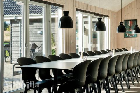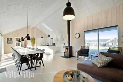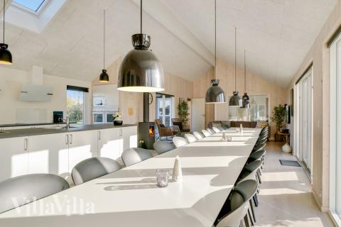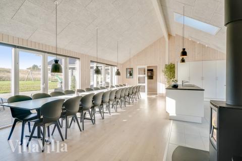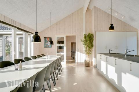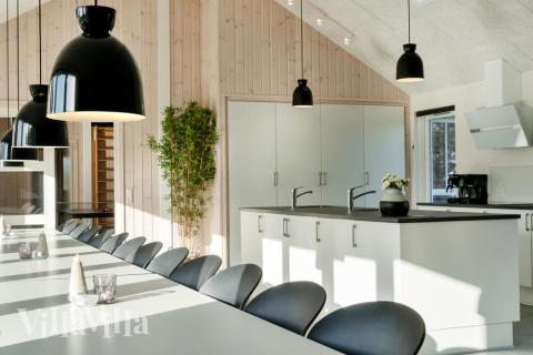 Når der skal laves mad til mange mennesker, er det vigtigt med et veludstyret køkken – det finder I her! Her er nemlig både to opvaskemaskiner, to håndvaske, to ovne og god plads i både køleskab og fryser. Rundt om det lange spisebord er der plads til at alle mand kan samles. I køkkenalrummet er der desuden brændeovn og sofagruppe foran fjernsynet.