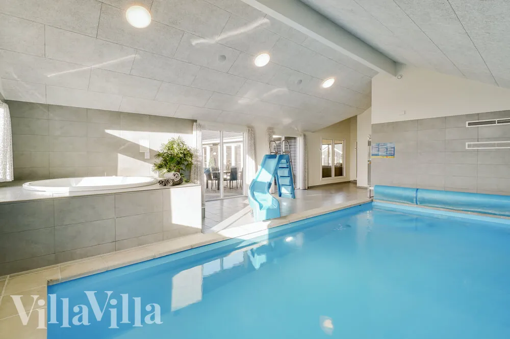 Poolområdet er uden tvivl en anden fordel ved dette sommerhus! Her er I nemlig sikret en badetur uanset årstiden. I kan komme i poolen (23 m2) ved brug af den romerske trappe eller vandrutsjebanen, hvis man er til mere fart over feltet. Poolen har også et modstrømsanlæg, så svømmeturen kan blive lidt hårdere. Efter svømning kan I nyde en tur i spabadet eller saunaen.