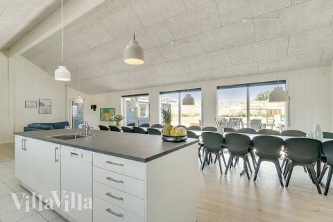I det store køkkenalrum, som har direkte udgang til terrassen, kan hele familien samles om måltiderne. Sommerhuset er udstyret med et dejligt stort og stilfuldt indrettet køkken. Køkkenet indeholder 2 opvaskemaskiner, ovne, vaske, komfurer, køleskabe og 1 fryser. På den måde sikres det, at alle får varm mad samtidig, og opvasken er klaret hurtigt. Køkkenalrummet er desuden udstyret med brændeovnen til lidt ekstra hygge de kølige dage. Det er ægte ferie!
