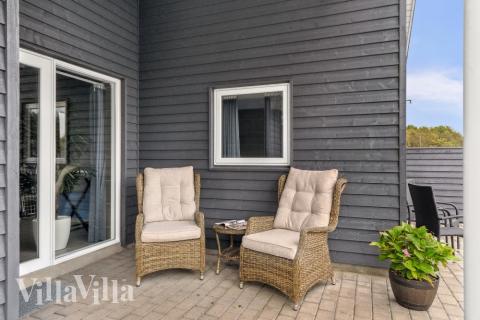 Udenfor er der også god plads til hygge og leg, på den delvist overdækkede terrasse, som også har havemøbler, terrassevarmere og grill. Børnene kan tillige lege i haven, hvor der findes en nedgravet trampolin, sandkasse og et legetårn med gynge.