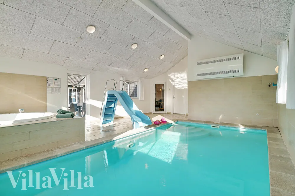 I det store poolrum kan der bades og svømmes i timevis i den 20 m2 store pool med romersk trappe og vandrutsjebane. Efter svømmeturen kan der slappes af i det store spabad med plads til 4-6 personer eller i saunaen.