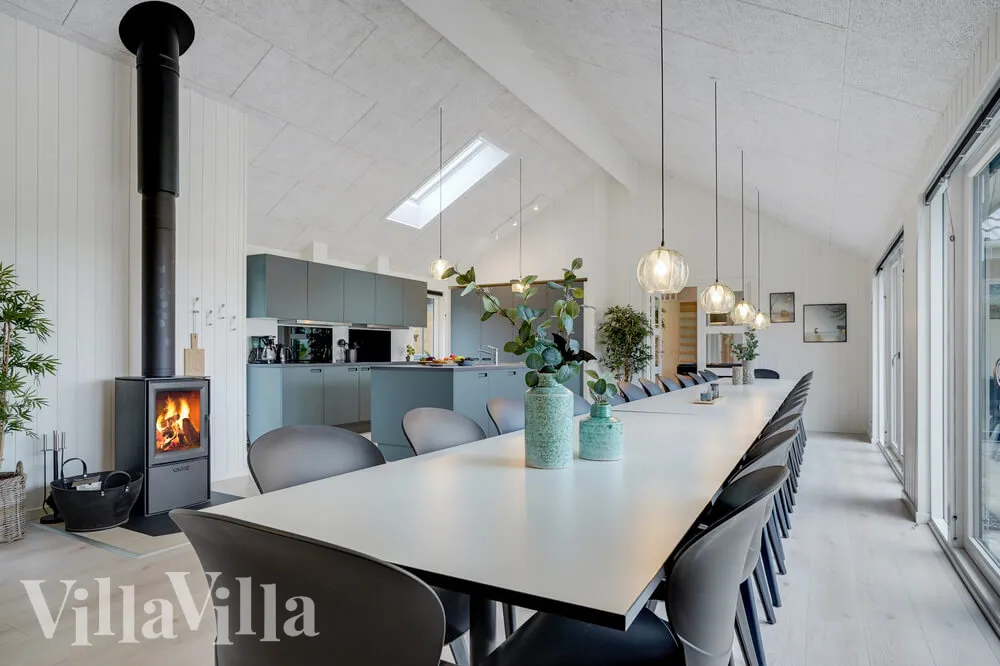 I sommerhusets midte finder I det store køkkenalrum. Her kan familien samles rundt om det lange spisebord i opholdsrummet, hvor I også kan slappe af i sofakrogen tæt på brændeovnen. Det store og flotte køkken er udstyret med både to håndvaske, to ovne, ekstra komfurplads, to opvaskemaskiner og god køleskabsplads. Altså kan flere kokke tage del i madlavningen.