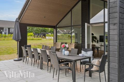 På husets udendørsområde venter ligeledes et legeparadis for feriens yngste gæster. Med legetårn, trampolin og gynge er der garanti for mange timers sjov. Mens de yngste gæster leger, kan de resterende gæster, hvis det danske vejr tillader det, forberede lækre måltider på husets grill eller slappe af på den delvist overdækkede terrasse med komfortable havemøbler.