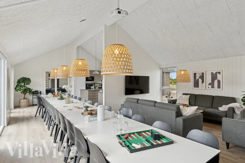 I sommerhusets store opholdsrum er der god plads til fælles måltider og afslapning. XL-køkkenet ligger i åben forbindelse med spisepladsen, så madlavning og samvær naturligt går hånd i hånd.