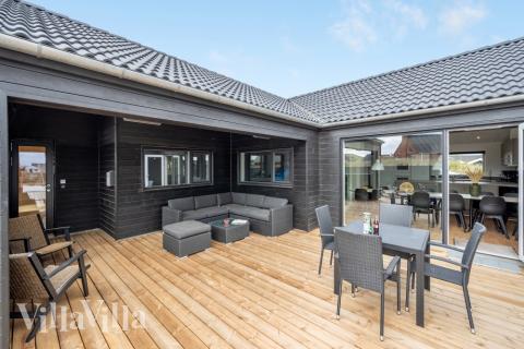 Er vejret i top, findes sommerhusets perle ude på den store terrasse. Her finder I masser plads til hygge, spisning og afslapning – også under delvis overdækning, hvis vejret skulle svigte. Her kan feriemiddagen tilberedes på grill og nydes i den friske luft, alt imens børnene hygger sig på trampolinen.