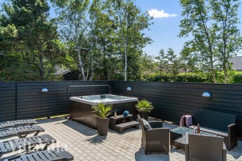 På denne terrasse finder I udover spiseplads og grill, endnu flere tegn på ”wellness”. I den ene ende af terrassen, kan et dyp i sommerhusets udespa nemlig nydes. Med sol eller varme i vejret, kan man tillige nyde en forfriskning i det hyggelige loungeområde, som sammen med udespaen er placeret bag et læhegn.
