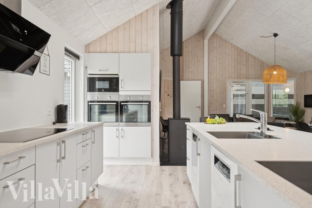 I midten af sommerhuset ligger det store og hyggelige køkkenalrum. Køkkenet er udstyret til at gøre madlavning til mange mennesker bl.a. med to komfurer, to opvaskemaskiner, to håndvaske og rigeligt med køle/fryseplads. I sofakrogen tæt på sommerhusets brændeovn kan der slappes af og hygges med en god bog eller film.