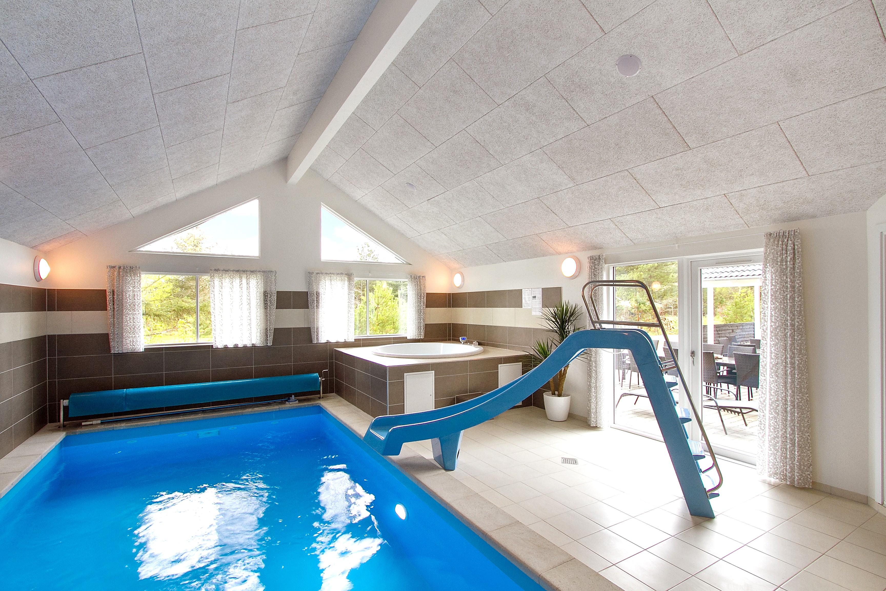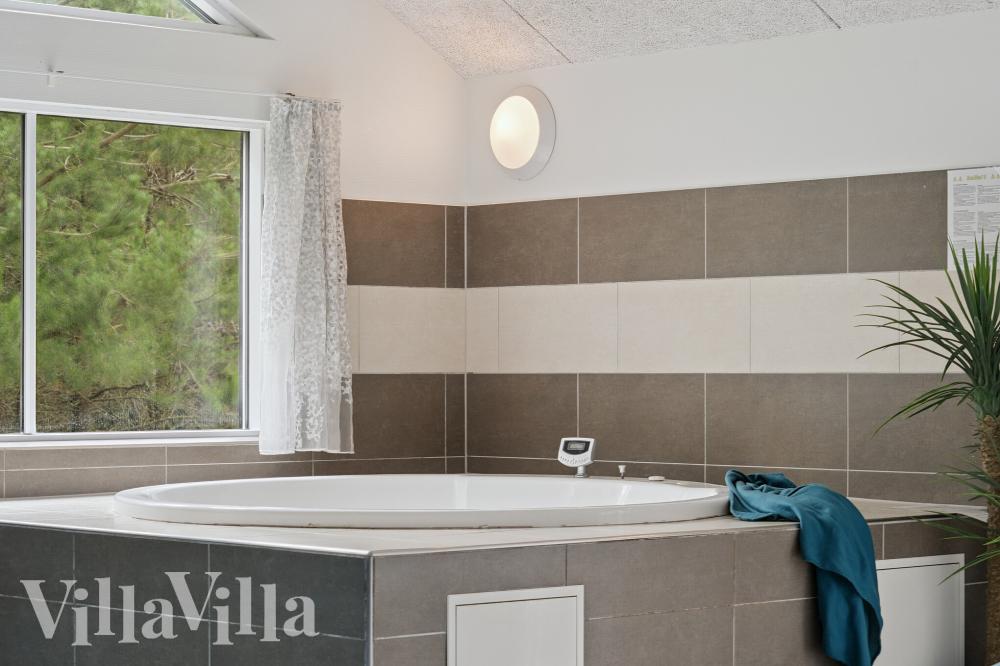 I sommerhusets dejlige wellness-afdeling finder I både en 20 m2 stor indendørs swimmingpool med vandrutsjebane og romersk trappe, et boblende spabad og en varm sauna.
