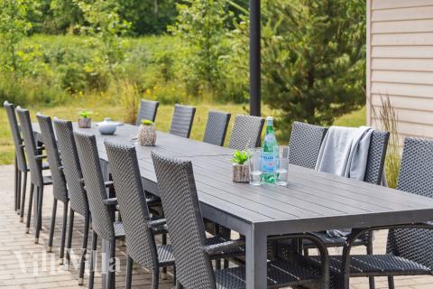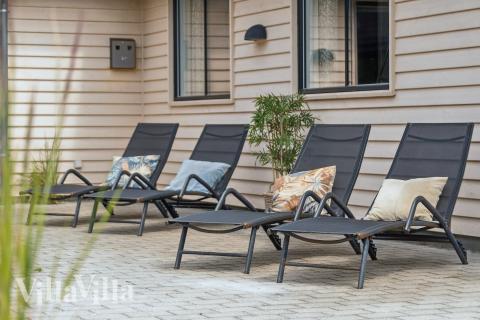 Nej. Som standard er der ingen parasol eller havehynder i vores huse. Mange huse har en delvis overdækket terrasse.