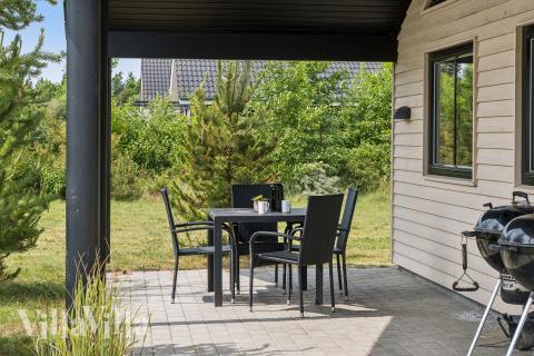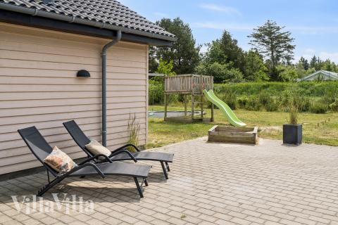 Sommerhuset har en flot delvist overdækket terrasse med grill og havemøbler, som er oplagt til en hyggelig grillaften eller afslapning i sommersolen. I haven er der gynge, sandkasse og trampolin til børnene.
