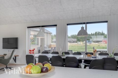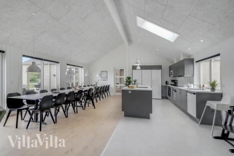 I centrum af sommerhuset ligger køkkenalrummet, som er hyggeligt indrettet med sofaafdeling foran fjernsynet og brændeovn. Køkkenet ligger i forbindelse med stuen og er velindrettet med to opvaskemaskiner, to ovne, to håndvaske og køleskabe. Rundt om det lange spisebord kan hele familien samles og hygge sig sammen.