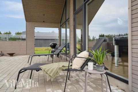 Nej. Som standard er der ingen parasol eller havehynder i vores huse. Mange huse har en delvis overdækket terrasse.
