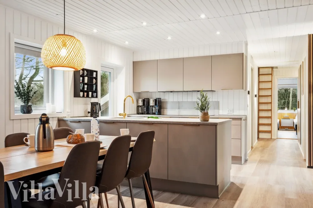 Køkkenet er funktionelt og har hele 2 køleskabe -ovne, -kogeplader og -opvaskemaskiner og åbner op til opholdsrummet, hvilket giver mulighed for at børn og voksne kan nyde hinandens selskab mens madlavningen står på. På en efterårsdag kan I hygge omkring brændeovnen i det lækre sofaområde.