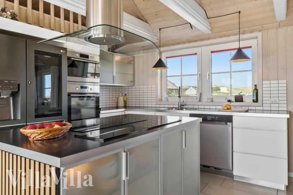 Husets hjerte er det indbydende opholdsrum, hvor I kan slappe af i den hyggelige stue og nyde varmen fra brændeovnen, mens andre forbereder maden i det stilfulde køkken med et rummeligt amerikanerkøleskab.